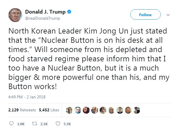 Dopo l’inizio di dicembre, con un risultato (quello della bomba) già ottenuto e con un’assicurazione sulla vita data dalla deterrenza nucleare, Kim iniziò un’opera di progressiva distensione con i vicini del sud, processo fortemente favorito dall’atteggiamento di disponibilità del presidente Moon. Sulle prime il governo statunitense non reagì bene, interpretando tale apertura come un tentativo di far entrare in rotta di collisione Washington e Seul. Ad inizio 2018 vi fu uno scambio di battute tra Trump e Kim relative al bottone nucleare presente sul tavolo di entrambi e alle dimensioni e grado di funzionamento dello stesso che, per tenore e tono, lasciò perplessa la maggior parte dei commentatori internazionali.