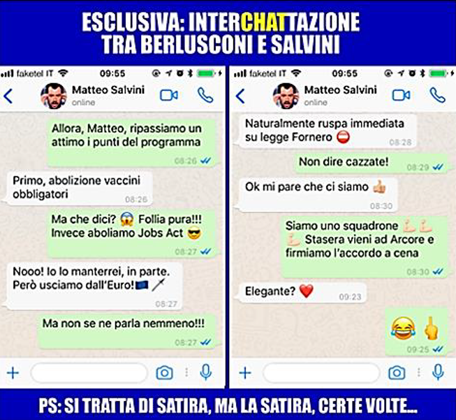 Lorenzo: In realtà direi entrambi. Giusto perché il termine satira ha un senso di “autorialità”, ma alla fine il messaggio è sempre lo stesso, cambia solamente il mezzo. Per fare un esempio: se prendiamo un video di blob, lo affibbiamo con il termine satira solamente perché diamo importanza al mezzo televisivo. Ma se prendiamo un video politico “meme” qualsiasi, i codici utilizzati sono praticamente identici, cambia solamente dove vengono pubblicati. McLuhan c’ha sempre ragione.