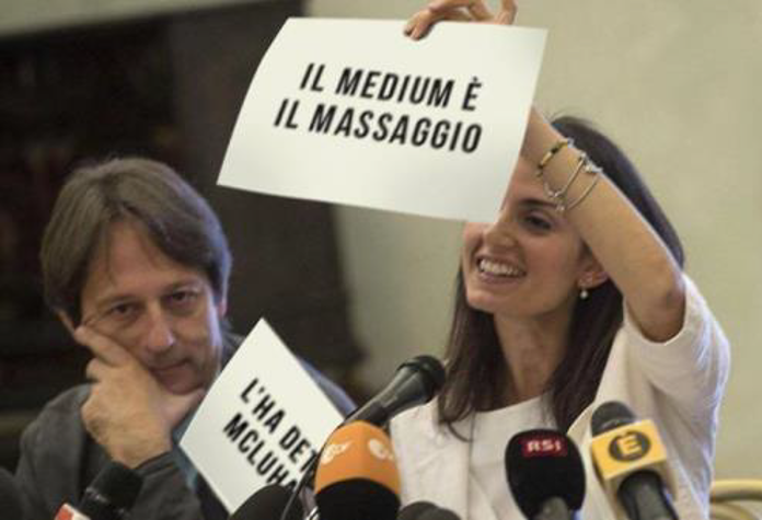 Gli esempi più concreti di quest’ultima dinamica li possono offrire le immagini proposte qui di seguito, prese dalla pagina Facebook Logo Comune: nelle immagini sottostanti vediamo come la semiotica dei funzionalisti russi si intreccia con la tormentata storia d’amore tra Alessandro Di Battista e Maria Elena Boschi (una delle storyline più popolari del panorama memico italiano), e come un meme sovrasfruttato -come quello dei cartelli di Virginia Raggi- possa arrivare ad altissimi livelli, se giustamente manipolato.
