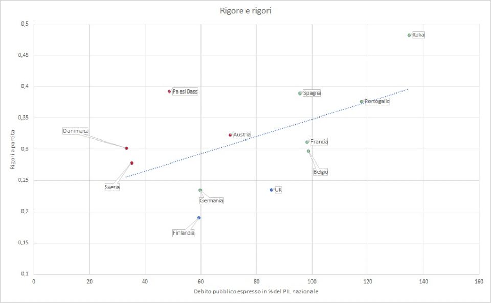 Sebbene si noti come esista una leggerissima correlazione tra i rigori assegnati a partita e il debito pubblico del paese che ospita il campionato, è evidente che questa è dovuta quasi interamente ai dati dell’Italia. Ci si poteva aspettare che tra rigore e rigori non ci fosse alcun legame – ovviamente – ma questa ironica analisi ci mostra che su entrambe le assi, su entrambi i temi, chiaramente scollegati, l’Italia è un outlier, rappresenta una sorta di anomalia. Sulla stabilità economica e sull’interpretazione dei falli di mano – quindi sul rigore generalmente, l’Italia dovrà lavorare.