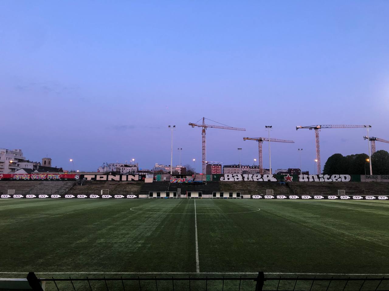 Eppure, come dicono i tifosi, «Le Red Star…c’est Bauer». Mentre aspetto il fischio d’inizio lo osservo e scatto qualche foto: la tribuna ovest, scarna, scoperta e decadente, è per metà ricoperta da erbacce. Sul muro che la delimita, su un’estremità c’è scritto Bauer renovation, mentre dall’altra un graffito rosso firmato Red Star lab recita FOOTBALL CULTURE FUTURE. Un lato corto è occupato da un grande palazzo triangolare che può lontanamente ricordare le Vele di Scampia, mentre la tribuna est, coperta da una tettoia sorretta da colonne di ferro che ostacolano la vista, è quella principale. La parte dove si siede la tifoseria abituale si chiama Tribune Rino della Negra. È importante capire perché.